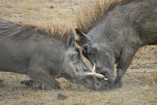 Пасутся бородавочники небольшими группами — до 15-20 свинок. И когда еды становится в достатке, страсти в стаде накаляются. Начинается сезон любви! Самцы объявляют брачный турнир. Только вот в ход идут не стихи и серенады, а здоровенные клыки. Правда, против своих кабаны не играют «на полную мощность». Такие драки напоминают скорее микс рестлинга и ралли бульдозеров. Секачи толкаются, рычат и бодаются, но без кровавых зрелищ.