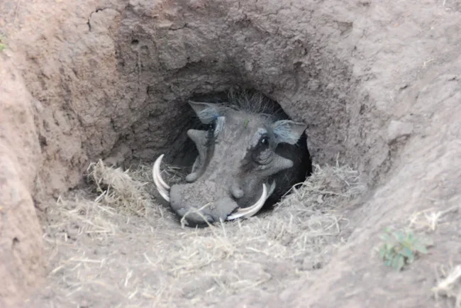 Среди свиней бородавочник — единственный, кто использует норы и способен их выкапывать самостоятельно. Чтобы проделать ход, он работает мощной головой с клыками, как лопатой.