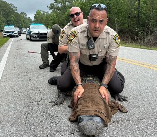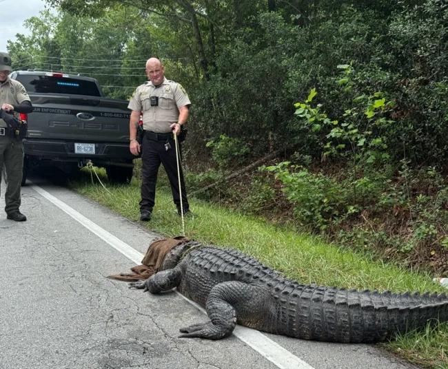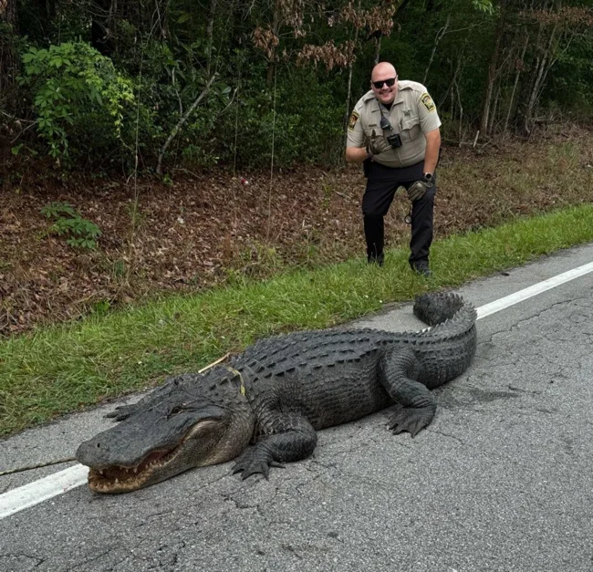 Инцидент произошел в округе Онслоу, Северная Каролина. 180-килограммовый аллигатор, которого с юмором прозвали Пепе, невозмутимо расположился посреди проезжей части, наслаждаясь солнечным теплом и, по словам очевидцев, даже "позируя" перед камерами изумленных водителей.