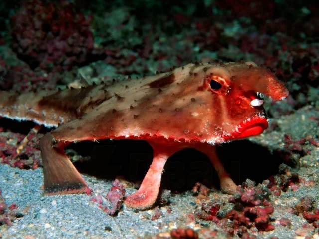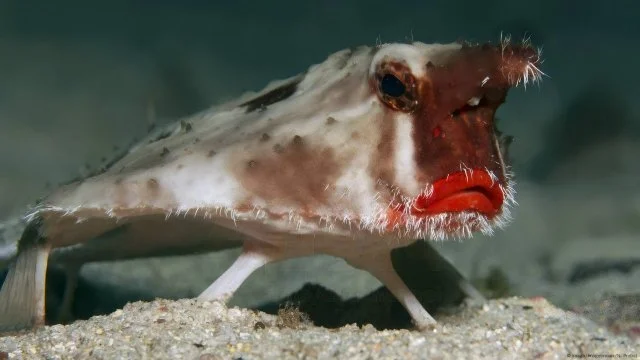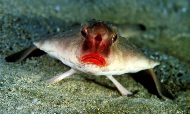 Знакомьтесь, перед вами нетопырь Дарвина — самая модная рыба! Сие создание обитает в водах Галапагосских островов. Рыбка уникальна по двум очевидным признакам. Первое — она не плавает, а ходит по дну океана на плавниках, как будто на ножках. Второе — возмутительно шикарные губищи, которые как будто бы накрасили красной помадой. Согласитесь... кого-то рыба явно напоминает.
