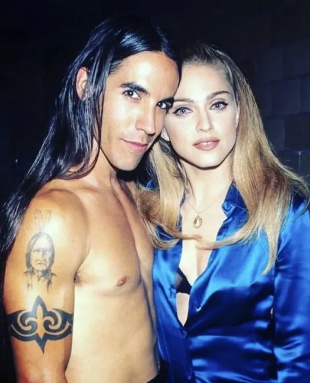 Неотразимая Мадонна в 1995-м году с Энтони Кидис на 12-й церемонии MTV VMA. Энтони известен фанатам рок-музыки в качестве лид-вокалиста группы Red Hot Chili Peppers. Интересно, что он придерживается здорового образа жизни, употребляет только вегетарианскую пищу и занимается йогой.