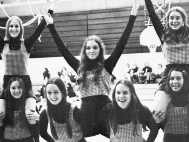 На фото 1973-го года видим будущую поп-звезду в школьные годы. Уже в юные годы она обладала мощной харизмой. На этом фотоснимке видим Мадонну по центру группы поддержки школы Рочестера Адамса, которую девушка окончила экстерном.