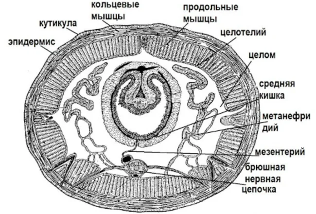 Это поперечный разрез червя. И все указанные на нём органы и ткани червь в состоянии восстановить с нуля. Но вот половые органы и центральный ганглий регенерации не поддаются.