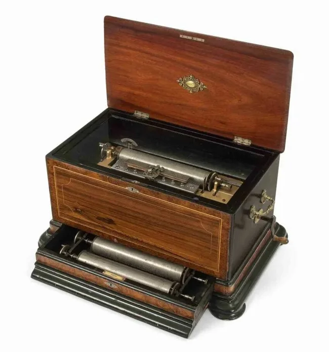 Музыкальная шкатулка. В выдвижной ящичек помещались дополнительные цилиндры с разными мелодиями.