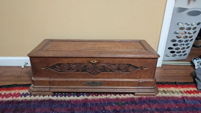 2. Деревянная коробка с выдвижным ящиком, откидной крышкой и металлическим декором