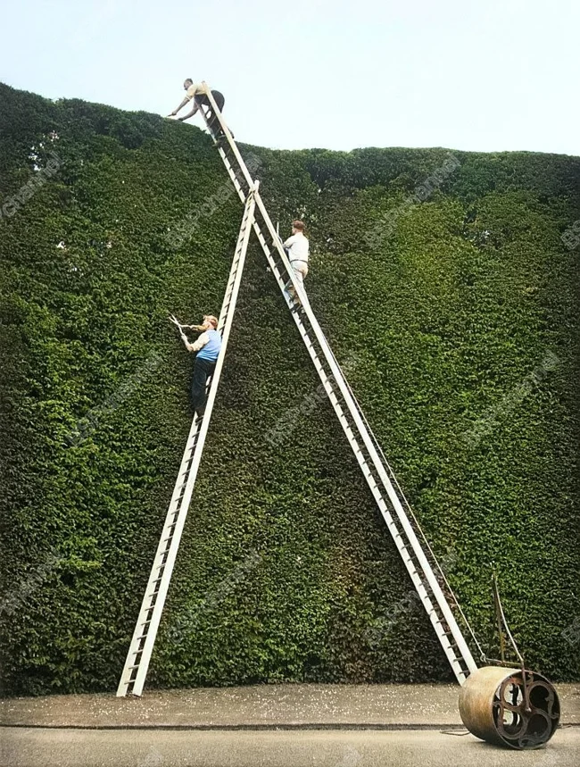 Садовники подстригают самый высокий в мире тисовый живой забор, посаженный в 1720 году первым графом Батерстом. Англия, 1962 год.