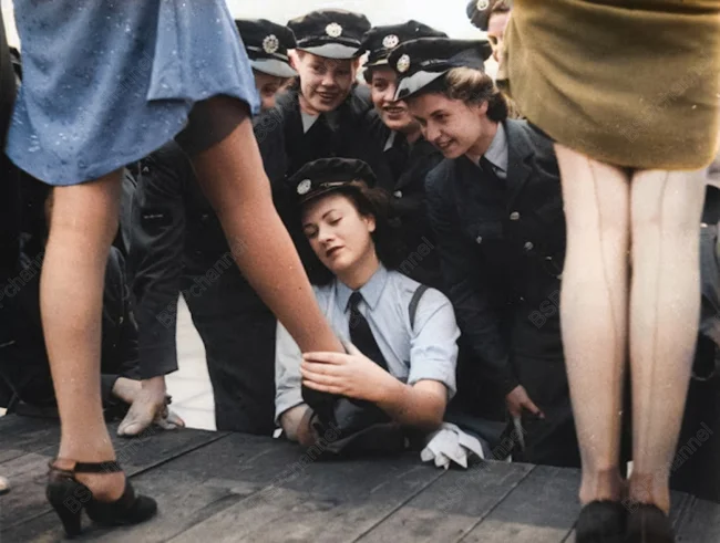 Девушки рассматривают модель чулок с искусственным шелком под названием 731, специально разработанную для военнослужащих на показе мод в Kennards в Кройдоне. Англия, 1943 год.