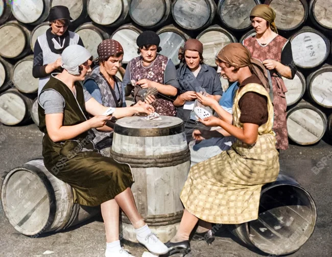 Женщины играют в карты среди бочек, которые они вскоре наполнят рыбой, во время сбора сельди в Ярмуте. Англия, 1933 год.