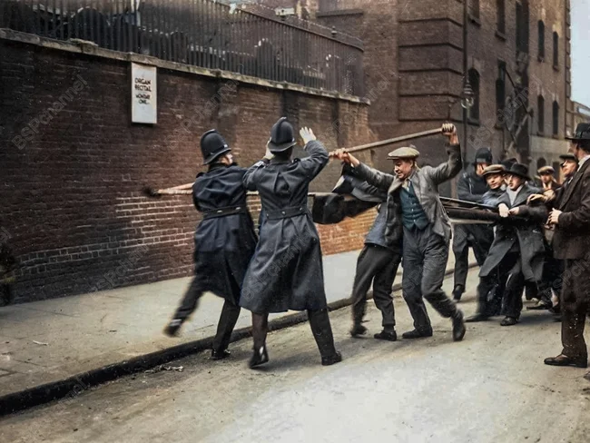 Коммунисты, вооружённые дубинками, борются с полицией во время демонстрации против безработицы. Лондон, 1930 год.