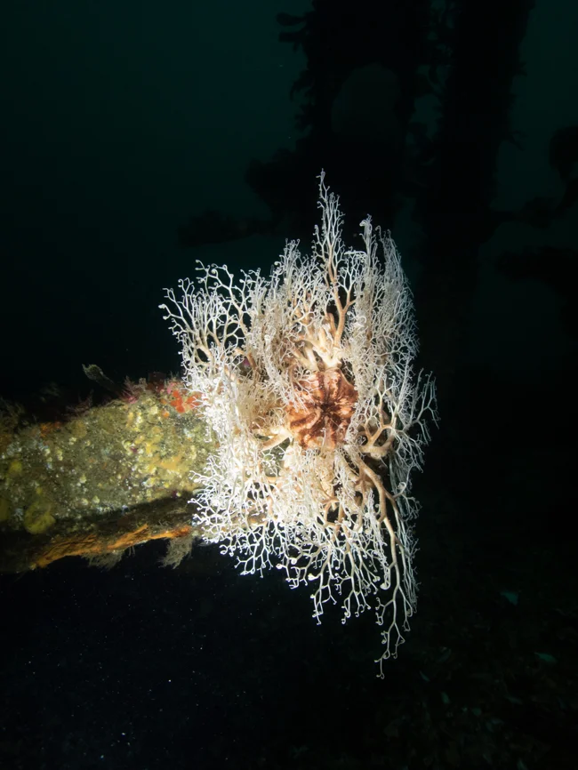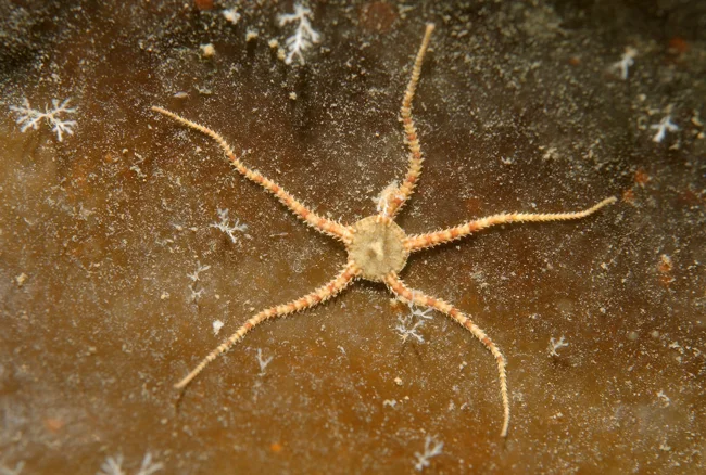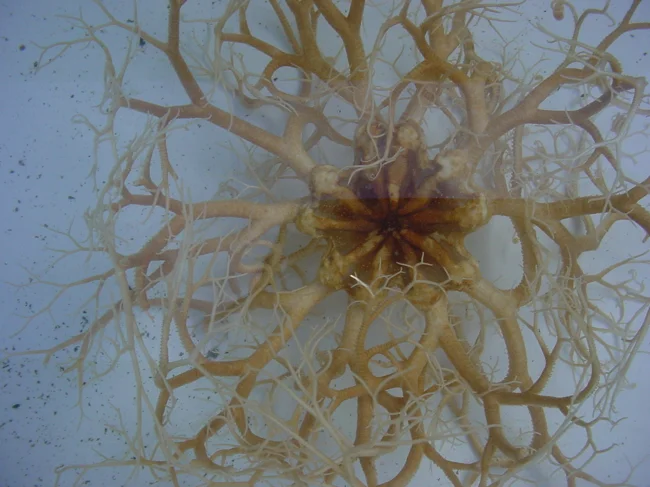 Кстати, лучей у офиур обычно пять штук. Да, даже у нашей. Просто каждый её луч делится надвое до тех пор, пока не превратится в мочалку из множества мелких отросточков. И количество этих отростков прямо зависит от возраста и размера животного. Офиура старше 10 лет может обзавестись несколькими тысячами щупалок, а размах её лучей достигает 1,8 метра. Это крупнейшая офиура на планете и одно из самых крупных иглокожих в принципе!