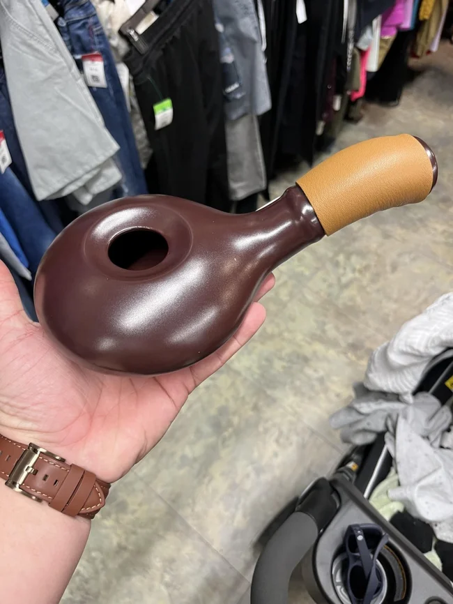 5. Керамический предмет с отверстием и ручкой, обёрнутой кожей