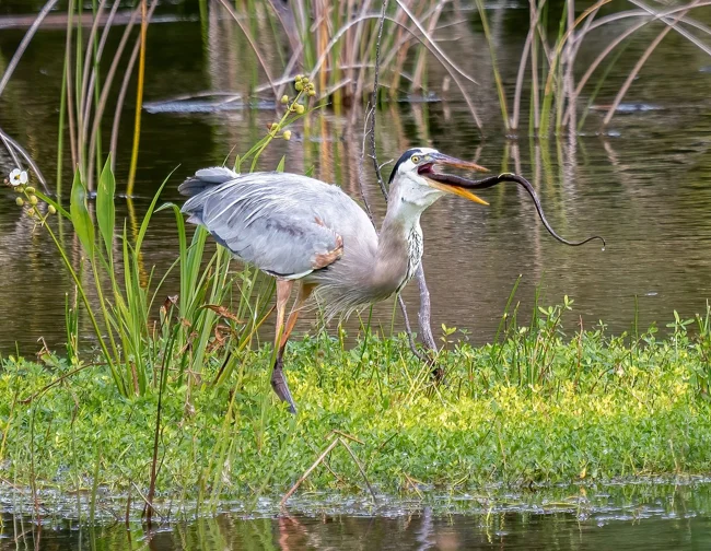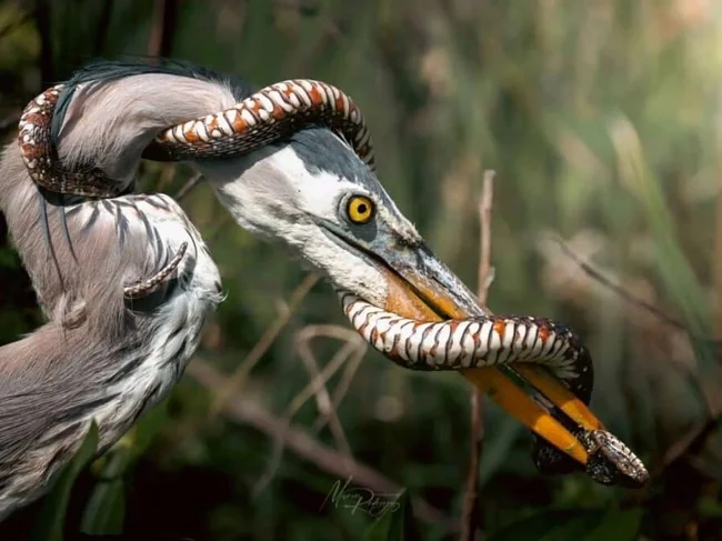 Со змеями бывает сложно. Если не уследить, то их длинные тела стягиваются вокруг шеи птицы, и тут начинается гонка на выносливость. Кто первый ослабит хват — змея или цапля?