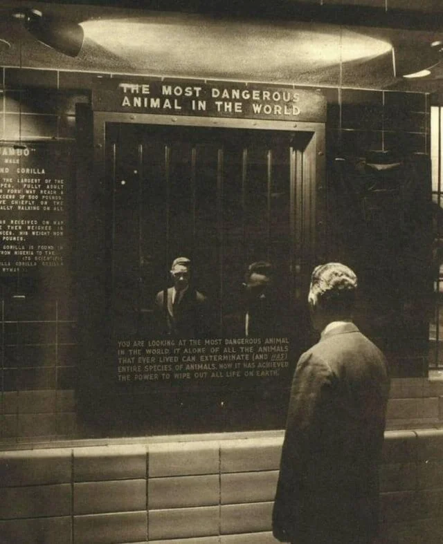 8. Мужчина стоит перед зеркалом с надписью "Самое опасное животное в мире" в зоопарке Бронкса, Нью-Йорк, 1963 год