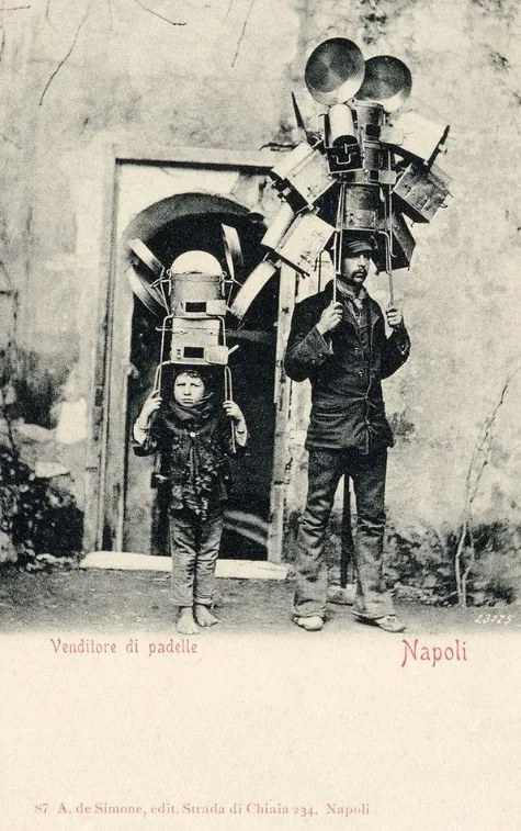 1. Издалека напоминающие огромных роботов продавцы кухонной утвари, Неаполь, 1903 год
