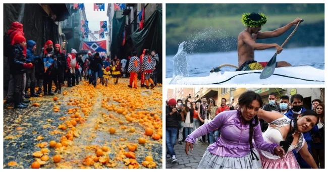 В итальянской Иврее тысячи людей три дня закидывают друг друга апельсинами в память о восстании против тиранов. Участники делятся на «повстанцев» и «защитников замка» в ярких костюмах.