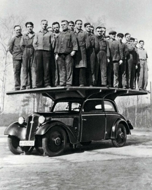 21. Рабочие демонстрируют прочность кузова Audi 920 1938 года выпуска