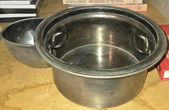 Это пароварка или водяная баня - бенмари (фр. bain-marie). Большая, широкая, но неглубокая кастрюля или прямоугольный невысокий бак с плотно закрывающейся крышкой, наполняемый на четверть, треть или половину кипятком. В бенмари помещаются кастрюли с супами, горшочки и сотейники с готовыми соусами и другими блюдами, которые необходимо держать горячими, но нельзя вновь подогревать перед подачей на стол.