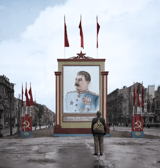 6. 3 июня 1945 года: немец рассматривает огромный портрет Сталина на бульваре Унтер-ден-Линден в Берлине