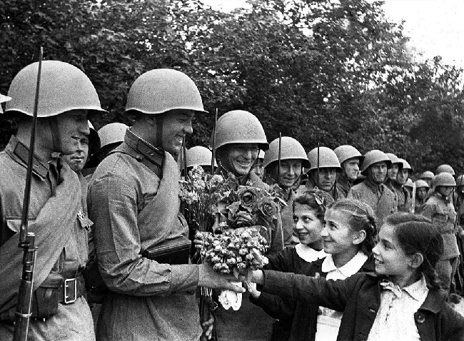 Дети дарят цветы красноармейцам во время парада в Кишинёве, посвящённого включению Бессарабии в состав СССР.
