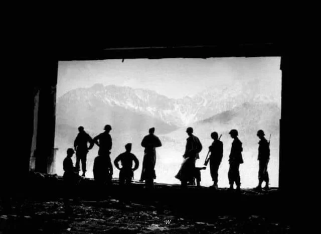 Американские солдаты стоят и любуются видом на горы из окна большой гостиной ныне разрушенного Бергхофа - бывшей резиденции Гитлера. Берхтесгаден, май 1945 года.