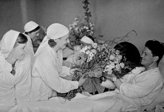 2. Московские работницы вручают цветы раненому бойцу Красной Армии (1943)