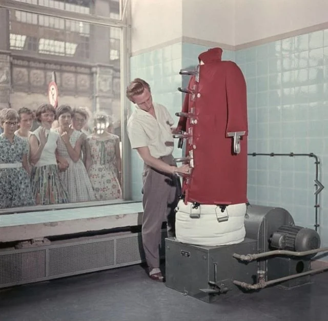 13. Работник ателье на площади Александерплац в Берлине отпаривает пальто на глазах у любопытной публики, 1960-е
