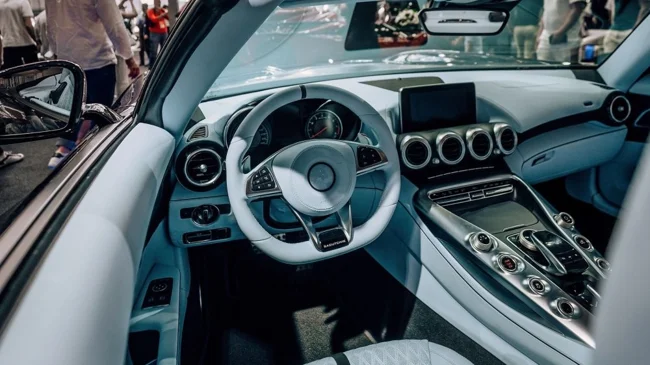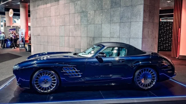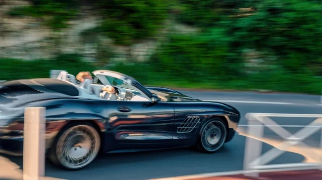 Все кузовные панели сделаны из карбона. С оригиналом родстер роднят, к примеру, выпуклые передние арки, круглая передняя светотехника, характерные «жабры» на бортах и оформление кормы. При этом начинка у Torpedo S полностью современная, так как базируется он на платформе Mercedes-AMG GT. Это хорошо заметно и по архитектуре интерьера, практически не изменившейся.