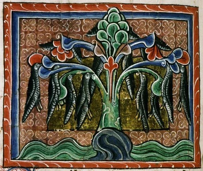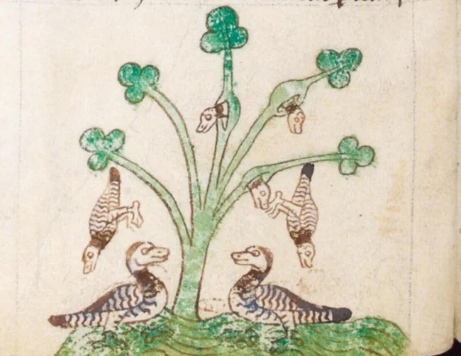 Я слышал, что в Шотландии есть дерево на берегу реки, которое приносит плоды в виде уток. Когда они почти созревают, они сами падают: одни на землю, другие в воду. Те, что падают на землю, гниют, а те, кто падает в воду, сразу оживают, расправляют крылья и улетают, полностью сформированные и оперённые.