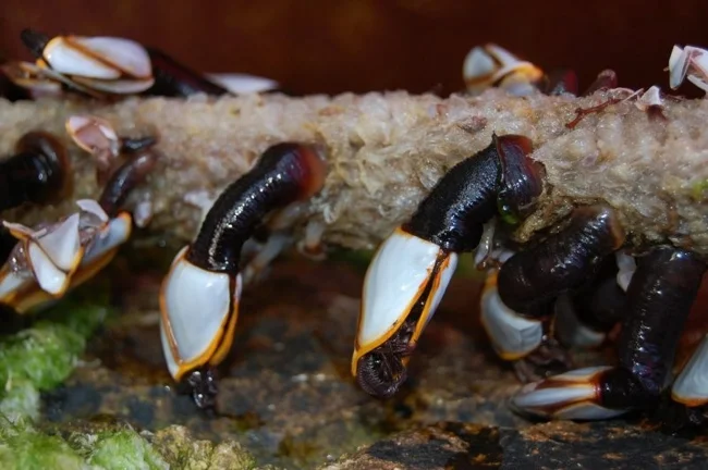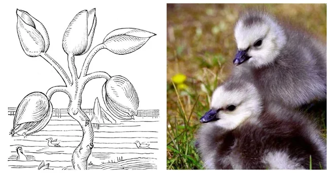 На самом деле Джеральд наблюдал гусиные ракушки (goose barnacles) — морских членистоногих, живущих на дрейфующих брёвнах и камнях. Белые выпуклые раковины и чёрные трубчатые ножки выглядят действительно загадочно. Для средневекового человека это могло показаться началом формирования птицы.
