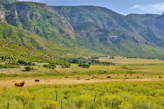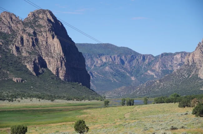 Ручей Ист-Крик течёт на восток, впадая в реку Ганнисон возле городка Уайтуотер, а Уэст-Крик на запад, к реке Долорес у поселения Гейтуэй. Между этими точками каньон протянулся на 70 километров, достигая глубины почти в километр и ширины до 6 километров.