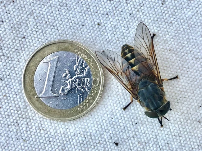 На картинке насекомыш мало отличается от других мух, но поверьте, в жизни его ни с кем не спутаешь. Толстое мощное тельце вырастает до 2,5 см в длину. На бумаге кажется немного. А по факту бычий слепень — один из крупнейших представителей двукрылых.