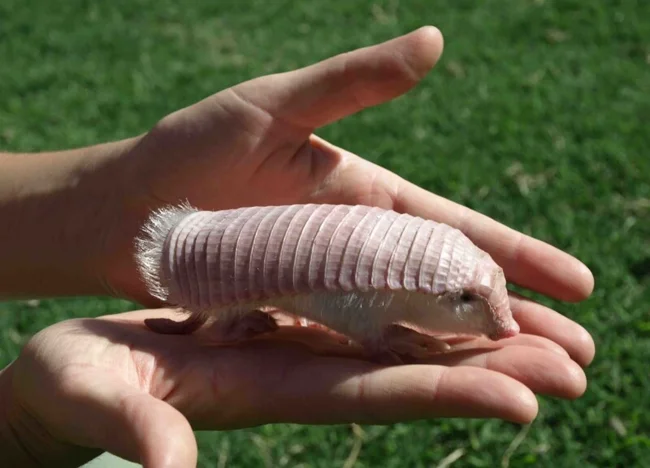 Прозвище "розовая фея" очень подходит этому существу. Его панцирь нежно-розового цвета (из-за просвечивающих кровеносных сосудов) и покрыт мягкими белыми волосками. Это идеальный камуфляж в песчаных дюнах Аргентины. Плащеносный броненосец благодаря мощным когтям может моментально закопаться в песок.