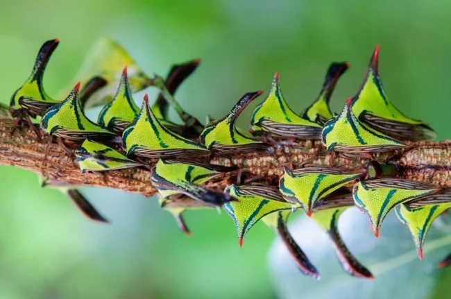 Эта совершенно инопланетная штука на самом деле хитро замаскированная цикадка, хотя по поводу видовой принадлежности этого насекомого учёные продолжают спорить. Умбония спиноза имеет вырост, который напоминает колючку акации или шип розы. Это идеальный камуфляж от птиц. Но самое удивительное, что форма «рога» отличается у разных популяций в зависимости от растений, среди которых они живут. Самка остаётся охранять яйца после кладки, а когда вылупляются личинки — кормит их, прокалывая кору растения, чтобы они пили сок.