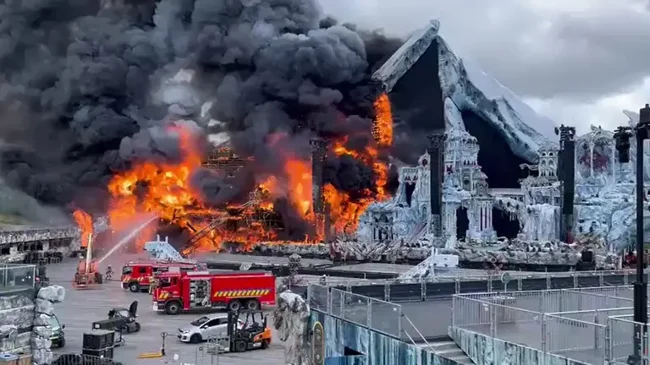Люди заметили черный дым и огонь со стороны площадки, на которой 18 июля должны были выступить всемирно известные музыканты. Огненная волна уничтожила сказочные фигуры львов и замков, которые должны были стать частью шоу. Есть риск, что мероприятие могут отменить.