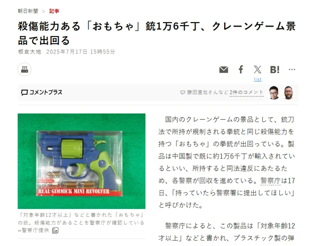 Оказалось, что популярные пластиковые револьверы Real Gimmick Mini Revolver, которые дети выигрывали в игровых автоматах, способны стрелять настоящими патронами. За полгода по стране разошлось около 16 000 таких «игрушек», и теперь власти бьют тревогу — изъять удалось лишь 1100 экземпляров.