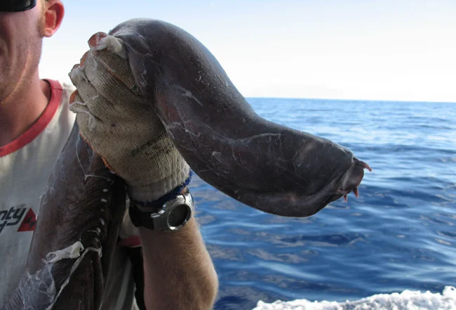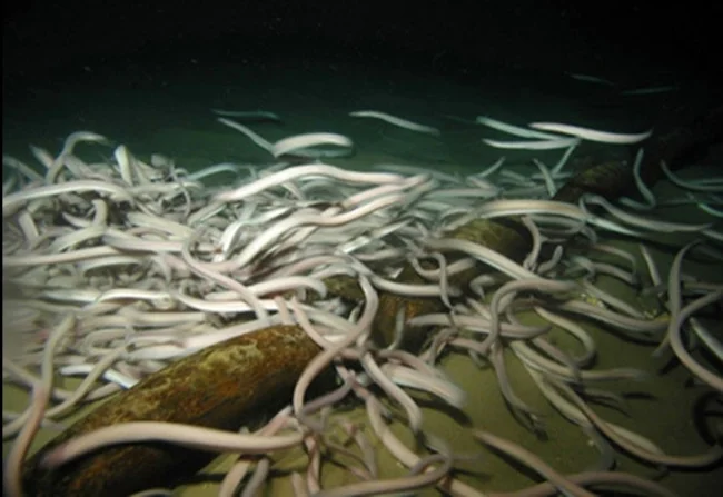 Единственное, над чем древние монстры заморочились, так это зубы. Вся передняя часть недо-рыбы утыкана рядами клыков-кольев. И какие ужасы она ими творит — мама родная! Миксина — и хищник, и падальщик одновременно. Чаще всего их находят в уже почивших тушах. Гады забираются внутрь и жадно пожирают потроха. Но самое страшное: то же самое миксина может проделать и с живой рыбой!