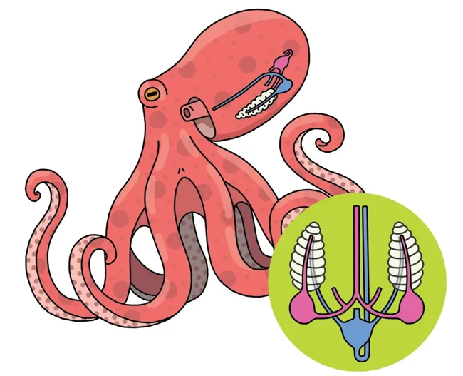 Основное сердце качает кровь по всему организму, дополнительные — помогают насыщать эту самую кровь кислородом. Жабры — это паутина из тонких капилляров. Чтобы закачать туда кровь, нужен серьезный напор, который одно осьминожье сердце не даёт. Но почему из всех жабродышащих только головоногие додумались отрастить дополнительные органы? Тут дело в цвете крови. Она у осьминогов голубая. В самом прямом смысле этого слова!