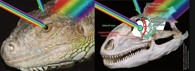 С его помощью земноводные и рептилии выстраивают свой режим дня. Непарный глаз входит в пинеальный комплекс. Это система органов, которая реагирует на освещенность вокруг и контролирует активность организма. У нас с вами эти функции выполняет мозг. А у рептилий — третий глаз. Именно он посылает сигнал о том, что настала ночь, пора вырабатывать мелатонин — гормон сна. Этим же третьим глазом холоднокровные «чувствуют» приближающуюся зиму. Око на затылке засекает, что дни становятся короче, а ночи — длиннее. А значит, пора готовить организм к анабиозу или спячке.