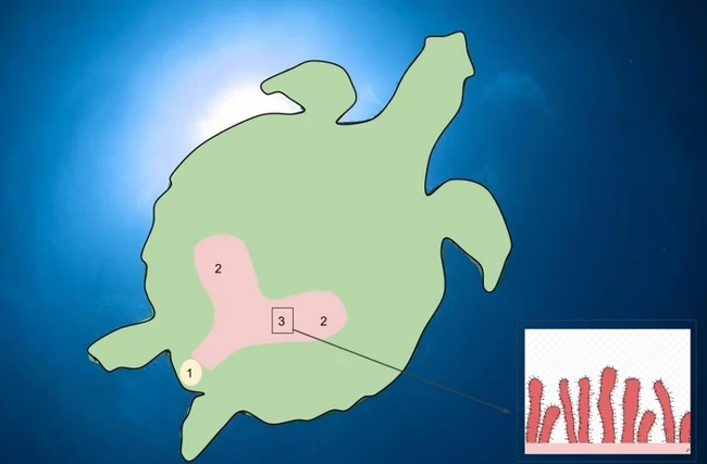 В пятой точке рептилий появились своеобразные «лёгкие» — клоакальные сумки. Они выстланы бурсом — специальной тканью, что пронизана кровеносными сосудами и сосочками. Сами знаете какой мускулатурой черепахи прокачивают воду туда-обратно. За счет постоянной циркуляции клоакальные сумки работают на подобие жабр. Только с другой стороны...