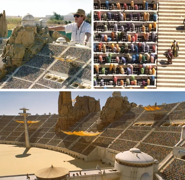 При создании оригинальной трилогии «Звездных войн» у Джорджа Лукаса был ограниченный бюджет, потому что он выделял на съемки практически только свои деньги и очень сильно рисковал, ведь не знал наверняка, окупятся ли его работы. Поэтому ему приходилось как можно меньше полагаться на дорогую компьютерную графику и обходиться практическими эффектами и миниатюрными моделями различных космических кораблей, планет и всего остального. По привычке он провернул то же самое спустя годы в «Скрытой угрозе», когда ему нужно было создать трибуну со зрителями, пришедшими на гонки. На самом деле зрителями были тысячи разноцветных ватных палочек.