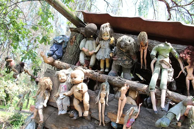 Более 50 лет назад Хулиан Сантана бросил семью и поселился на острове посреди каналов Сочимилько. По одной из версий, он посвятил жизнь памяти утонувшей девочки, хотя родственники утверждают, что трагедия была плодом его воображения. Так или иначе, Сантана начал собирать кукол и развешивать их по всему острову. Со временем это место превратилось в жутковатый кукольный лабиринт.