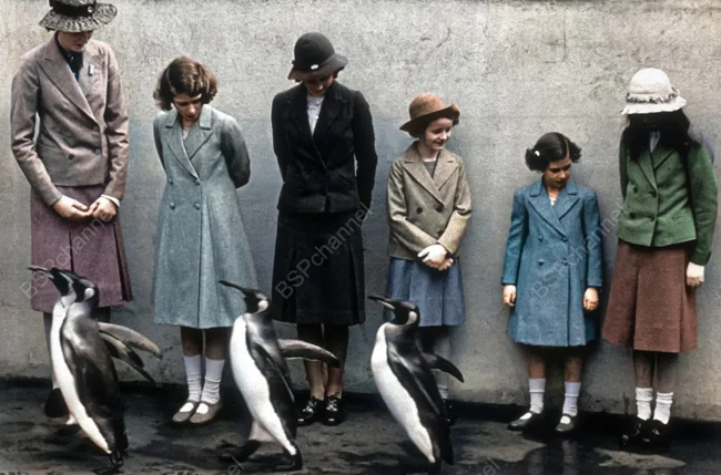 Британская королевская семья и королевские пингвины. Лондон, 1938 год.