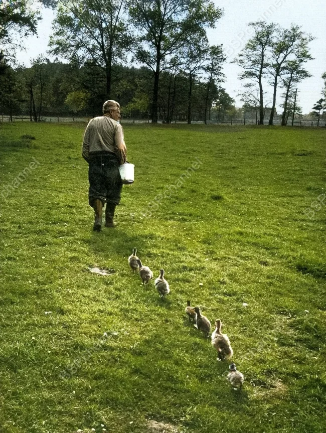 Доктор Конрад Лоренц, венский ученый и специалист по поведению животных, с гусятами, которые принимают его за свою маму, 1955 год.