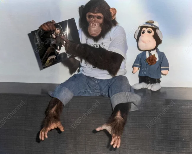 Портрет Баблза, шимпанзе, принадлежащего популярном Майклу Джексону, одетого в джинсы и футболку, держащего свою фотографию с певцом, в то время как плюшевая кукла Баблз стоит рядом с ним, Токио, Япония, 1987 год.