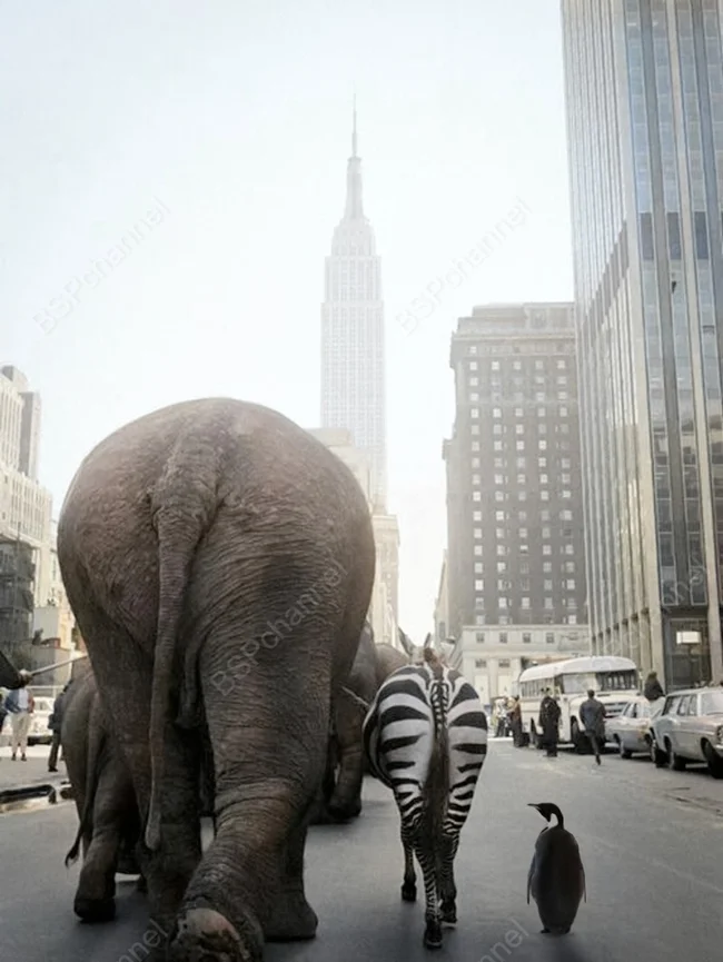 Группа слонов и зебр идет по 33-й улице в Манхэттене, 1968 год.