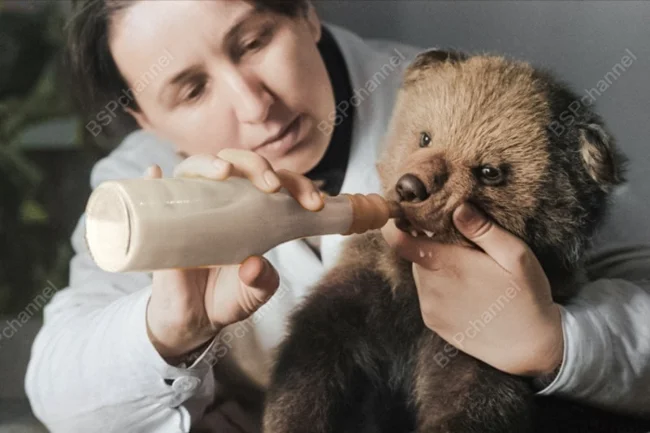 Кишиневский зоопарк. Сотрудница зоопарка К.А. Бригидина во время кормления медвежонка, 1987 год.