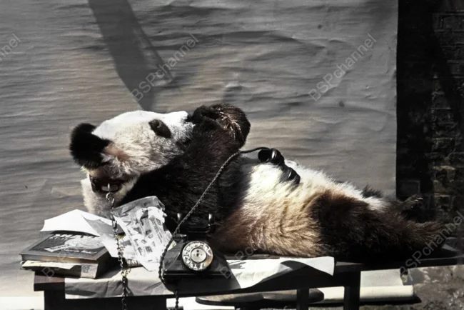 Панда лежит на спине с телефонной трубкой на животе, 1940 год.