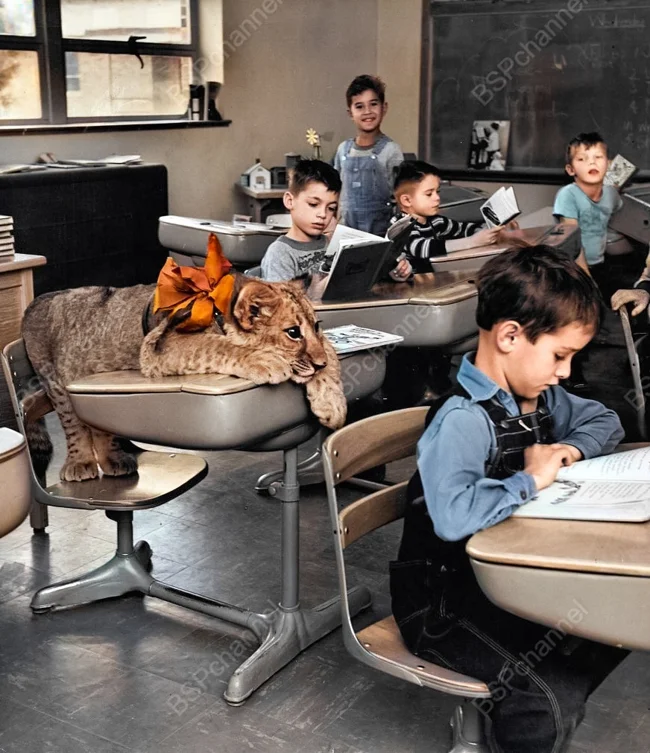 Львенок посещает класс второго класса в Гарден-Сити, штат Канзас, 1951 год.