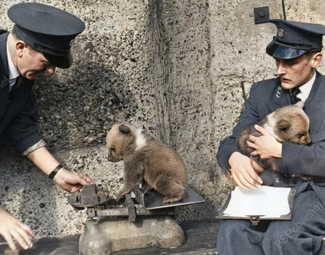 Смотрители взвешивают сирийских медвежат на весах. Медвежата родились и выросли в Лондонском зоопарке. Оба — самцы, весом по 3,8 кг каждый, 1959 год.