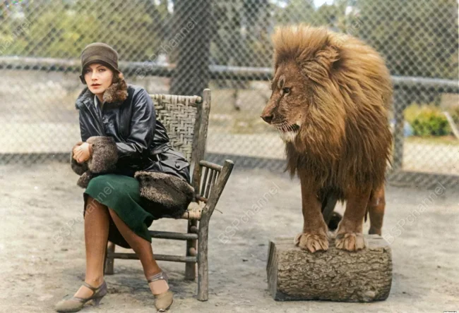 Луи Майер, основатель легендарной голливудской студии Metro-Goldwyn-Mayer (MGM), увидел одну из ранних работ юной шведской актрисы Греты Гарбо — и был настолько впечатлён, что немедленно пригласил её в Америку. В 1925 году, в возрасте всего 19 лет, Гарбо приехала в Голливуд, чтобы начать свою звёздную карьеру. Чтобы её дебют стал громким и запоминающимся, Майер разработал масштабную пиар-кампанию — дерзкую, эффектную и очень показательную. В центре внимания оказалась фотосессия, в которой новую звезду студии решили представить вместе с её тёзкой — львом Джеком, символом MGM. Для съёмки был приглашён модный спортивный фотограф Дон Гиллум, а съёмочная группа отправилась на львиное ранчо. Сцена получилась напряжённой: Грета, одетая в элегантное платье, оказалась в непосредственной близости от огромного хищника, что вызвало у неё вполне понятный страх. Лев, в свою очередь, выглядел растерянным — он явно не понимал, зачем вокруг него поднялась такая суета и кто эта женщина рядом с ним. Тем не менее эмоции обоих — и актрисы, и животного были великолепно запечатлены на кадре. Этот снимок стал одной из самых знаменитых икон Голливуда, символизируя встречу новой звезды экрана и царя зверей.